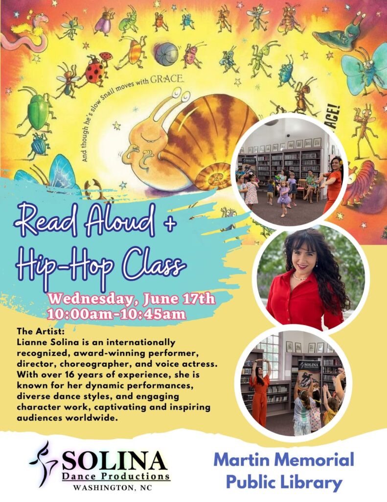 Join performance artist, Lianne Solina for fun children’s activities on TUESDAY, JUNE 17TH, 10 AM at Martin Memorial Library. (*Note that the day of this event is Tuesday, although the flyer says Wednesday.*)