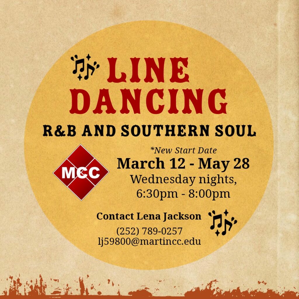 Register now for Martin Community College’s Line Dancing Class series, taking place on ***UPDATED DATES*** Monday nights from April 14th to July 14th. ***UPDATED DATES*** Please contact Lena Jackson at 252-789-0257 to register.