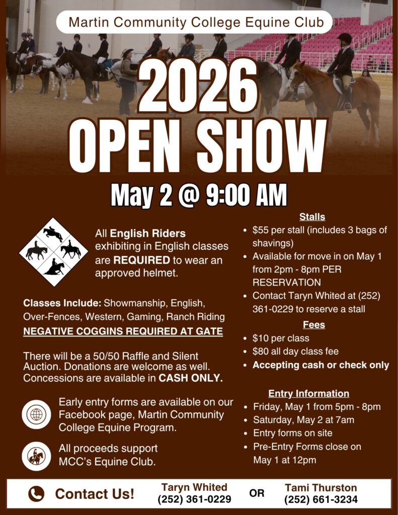 The Martin Community College Equine Program is excited to announce the upcoming 2026 MCC Open Horse Show on May 2nd, and we’re inviting YOU to be part of something truly special.