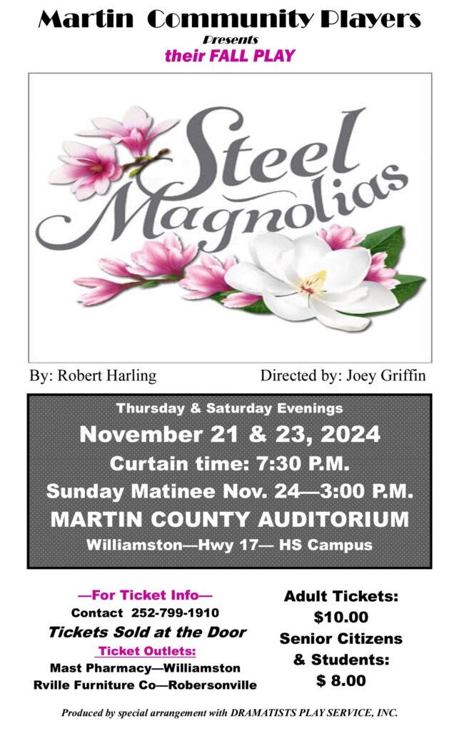 We cordially invite you to attend Martin Community Players’ heartwarming production of “Steel Magnolias at Truvy’s Beauty Salon” on Thursday, November 21, and Saturday, November 23, at 7:30 pm and Sunday, November 24, at 3:00 pm for an evening of laughter and tears.