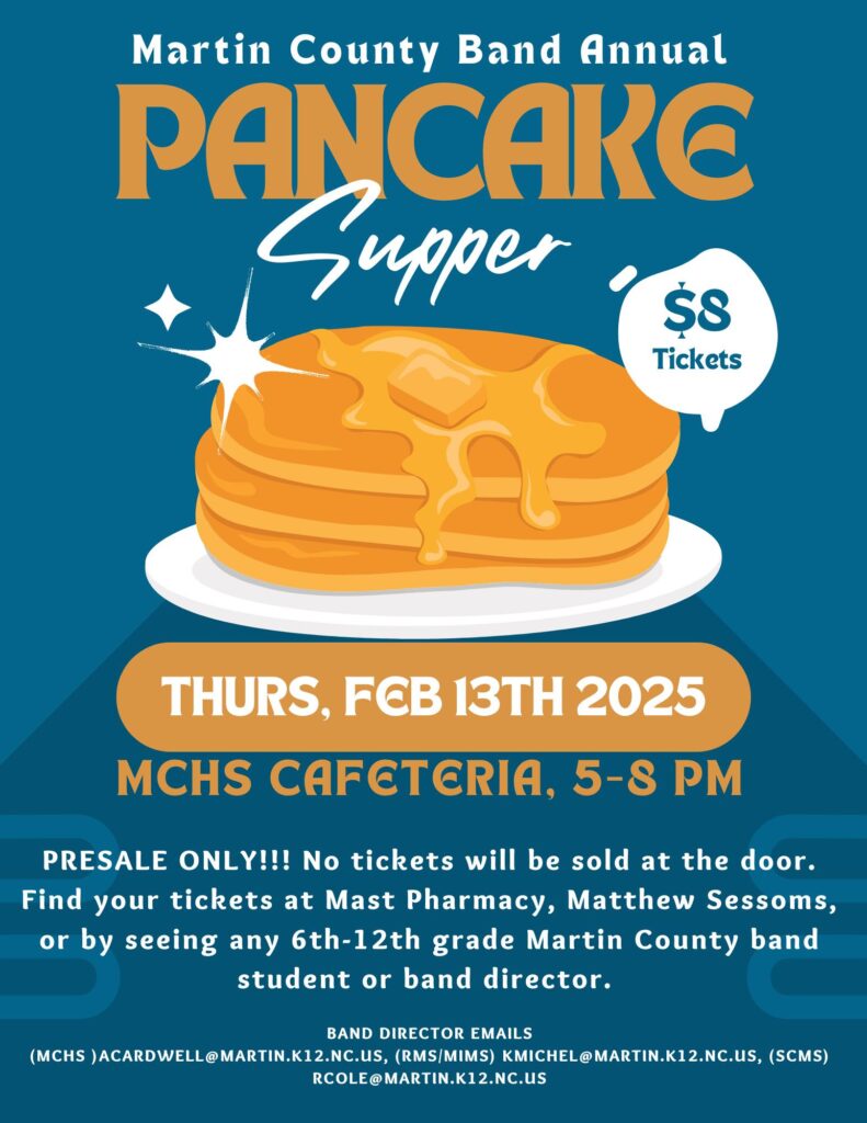 The Annual Martin County Band Pancake Supper is February 13th. This year tickets are PRESALE ONLY. You can still dine-in or take-out, you just cannot purchase tickets at the door. Tickets are on sale with any 6-12th grade band student, or may be purchased at Matthew Sessoms Chrysler Dodge Jeep Ram and Mast Pharmacy & Compounding.