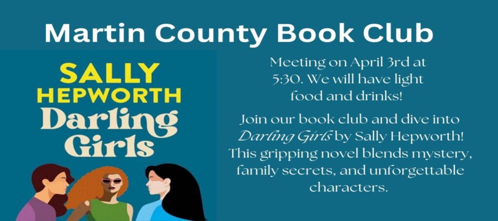 Join Martin County Book Club in a discussion of Darling Girls by Sally Hepworth in the Ella Mae Abbitt meeting room at the library. Books are available for checkout from the circulation desk. Make sure to follow us on Facebook at Martin County NC Book Club!