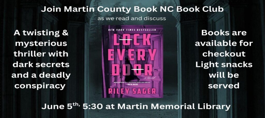 Join Library Assistant Heather Nelson in a discussion of Lock Every Door by Riley Sager in the Ella Mae Abbitt meeting room. Virtual options are available for those who would like to attend virtually. Email hnelson@bhmlib.org for more information or come by the library. Books are available for checkout at the circulation desk. Follow the book club on Facebook here: Martin County NC Book Club!