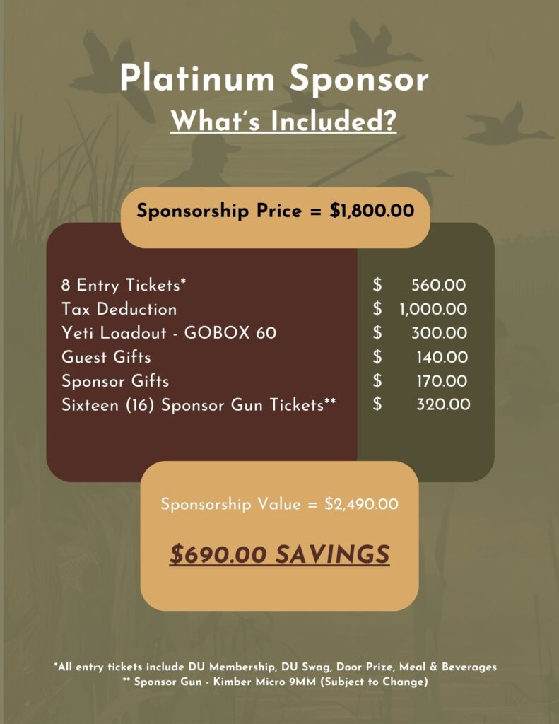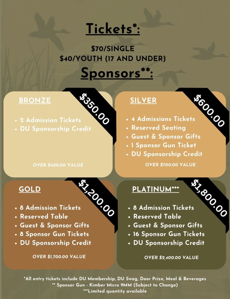 Don’t forget about the Super Duck Raffle! Get over $1000 worth of gun tickets, general raffle, and package tickets for only $500, plus a chance at the winner-take-all gun selection as well. Don’t miss out on this awesome bargain price!