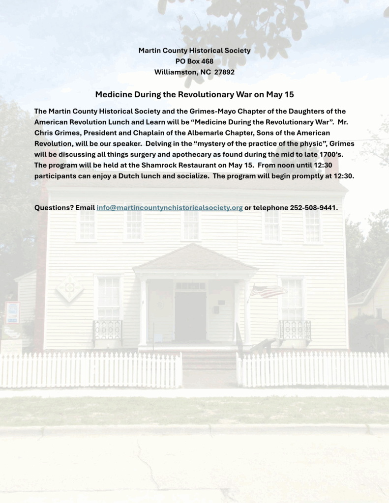 All are invited to join the Martin County Historical Society and Grimes-Mayo Chapter of the Daughters of the American Revolution for their lunch & learn program this February through May at Shamrock Restaurant in Williamston. On May 15th, Mr. Chris Grimes, President of the Edenton Sons of the American Revolution will speak on medicine during the 1700s.