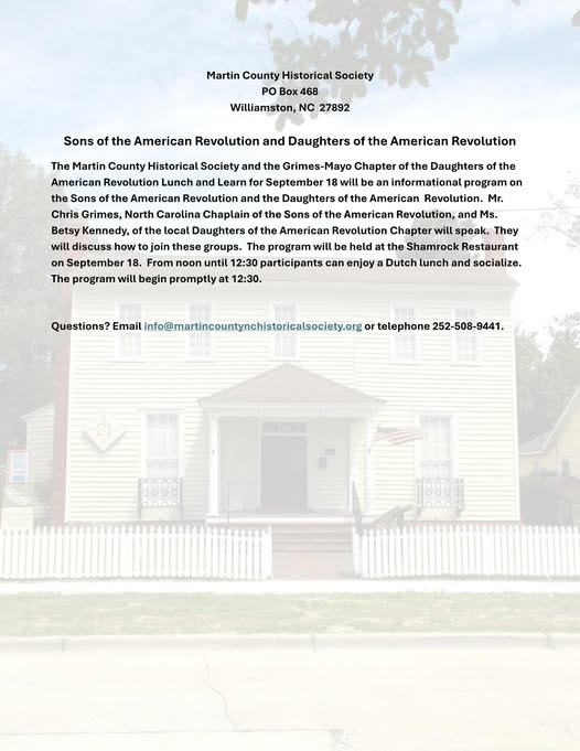 All are invited to join the Martin County Historical Society and Grimes-Mayo Chapter of the Daughters of the American Revolution for their lunch & learn program on September 18th at Shamrock Restaurant in Williamston. The Martin County Historical Society hopes you can attend this informative program on the Sons of the American Revolution and the Daughters of the American Revolution. You may be eligible to join these groups!