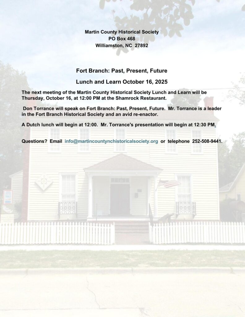 All are invited to join the Martin County Historical Society and Don Torrence of the Fort Branch Historical Society for a lunch & learn program on October 16th at Shamrock Restaurant in Williamston. The Martin County Historical Society hopes you can attend this informative program on Fort Branch: Past, Present, Future.