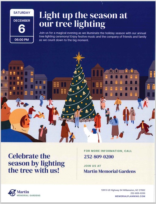 Martin Memorial Gardens hosts their annual tree lighting ceremony and luminary service at the park grounds on Saturday, December 6th, at 6 PM. Celebrate the season with friends, family, and festive music!
