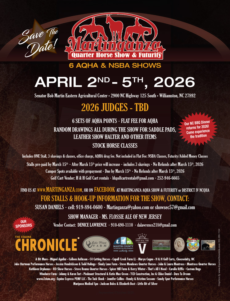 The 2026 Martinganza Quarter Horse Show & Futurity will take place April 2nd – 5th, 2025, at the Senator Bob Martin Eastern Agricultural Center. Bring your family to enjoy riders competing in a variety of classes. No admission fee will be charged. Please visit www.martinganza.com or call (919) 894-0600 for more information.
