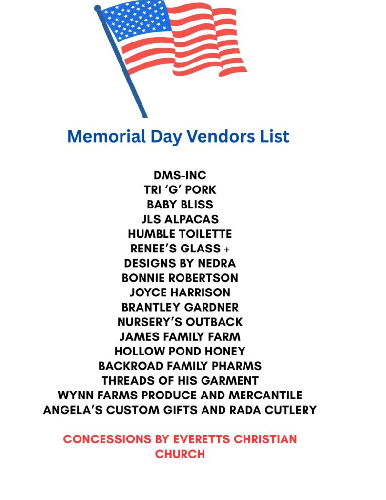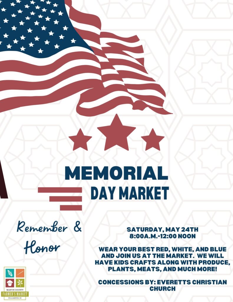 Come out to the Farmers Market on Saturday, May 24th for a special Memorial Day market event. There will be kids craft activities and concessions are by Everetts Christian Church.