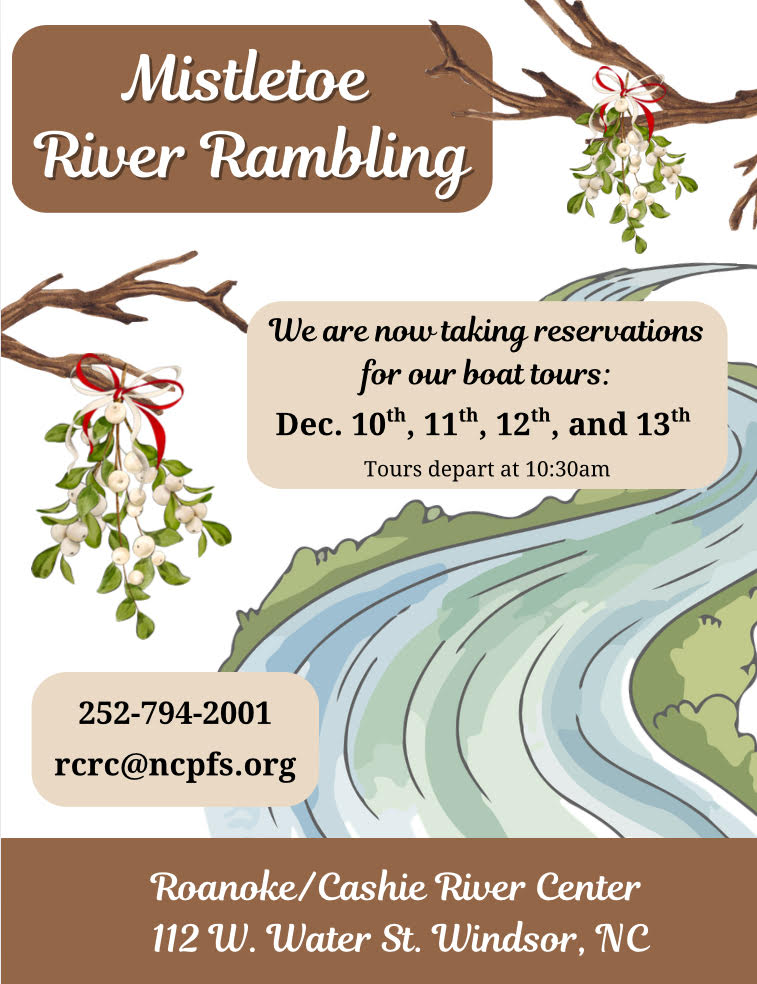 Don’t delay! Sign up for a Mistletoe Boat Tour! Spots are limited, so please call 252-784-2001 or email RCRC@ncpfs.org to reserve your spot. Tours begin on Wednesday, December 10th, through Saturday, December 13th. Each tour will begin at 10:30 AM.
