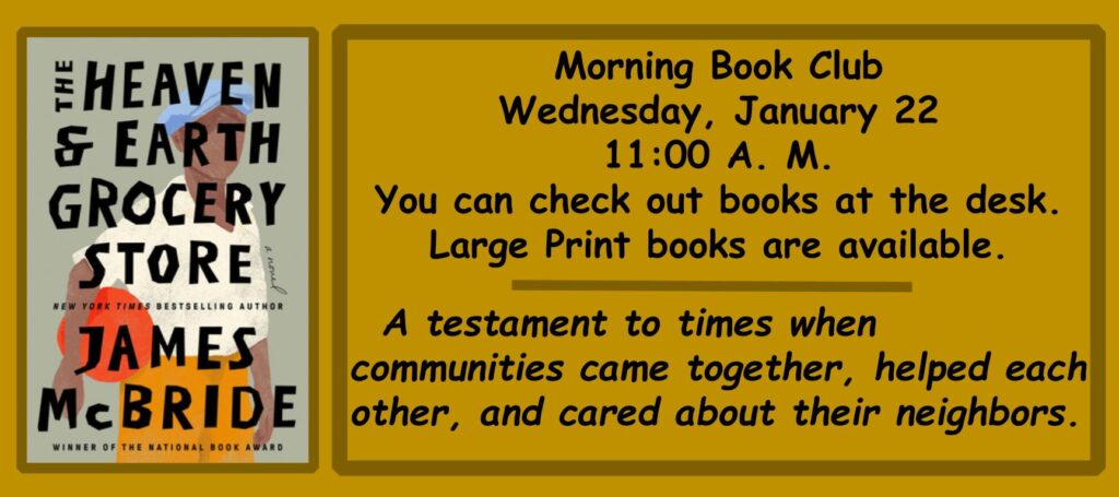 Join Library Assistant Kit Reddick as she leads a discussion of The Heaven and Earth Grocery Store by James McBride. Books including large print are available for checkout at the circulation desk.