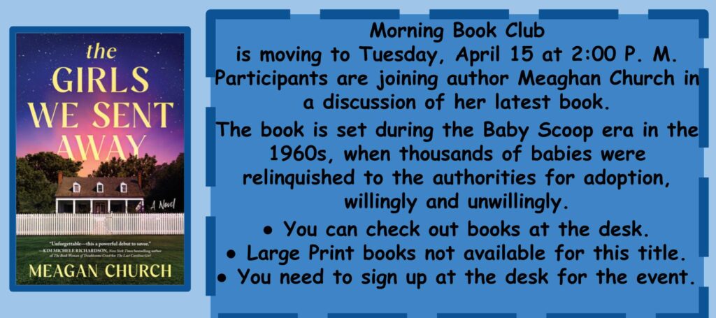 This month, the morning bookclub is reading The Girls We Sent Away by Meagan Church. Instead of a morning discussion, participants are invited to Megan Church’s Meet the Author Event in the afternoon. Copies of her books will be available for purchase and include a signing by the author. Light refreshments will be served.