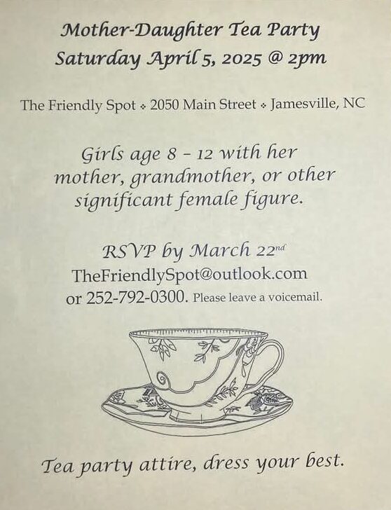 The Friendly Spot in Jamesville is hosting a Mother-Daughter Tea Party on Saturday April 5th at 2 PM. Dress your best in tea party attire!