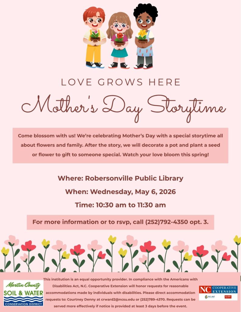 On May 6th, the Martin County Cooperative Extension and Martin County Soil & Water Conservation District will be visiting the Robersonville Public Library to do a special Mother’s Day Storytime with a craft activity. Don’t miss this fun event!