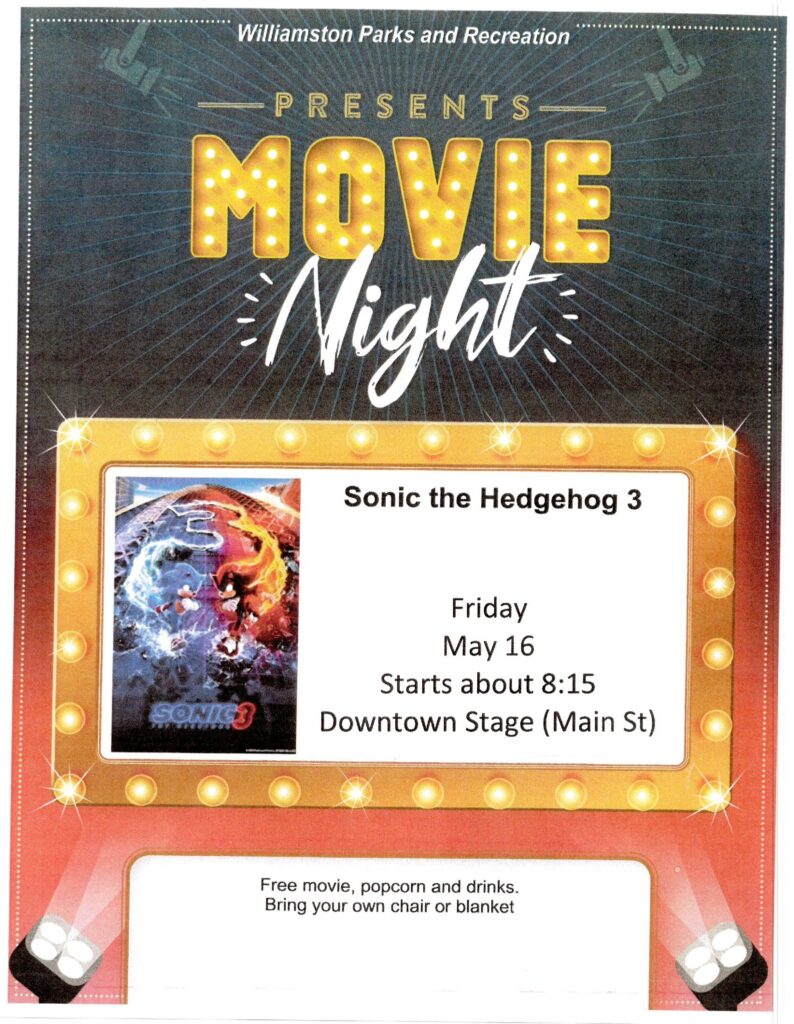 Save the date for movie night featuring Sonic the Hedgehog 3 at the Main Street Community Stage on Friday, June 6th at 8:15 PM! (***This event is the new date – had to reschedule the May 30th event due to weather.***)
