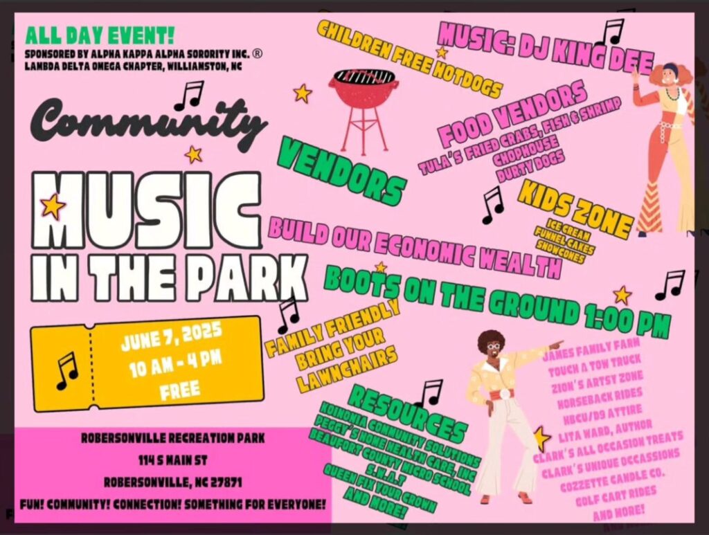 “MUSIC IN THE PARK” is coming again soon to ROBERSONVILLE RECREATION PARK at 114 S MAIN ST in Robersonville on Saturday, June 7th, 10 AM to 4 PM. FREE ADMISSION, DJ, free hot dogs for kids, kids zone, economic resources, food vendors, horseback rides, HBCU/D9 attire, golf cart rides, & much more. Family friendly. Don’t forget to bring your lawn chairs!
