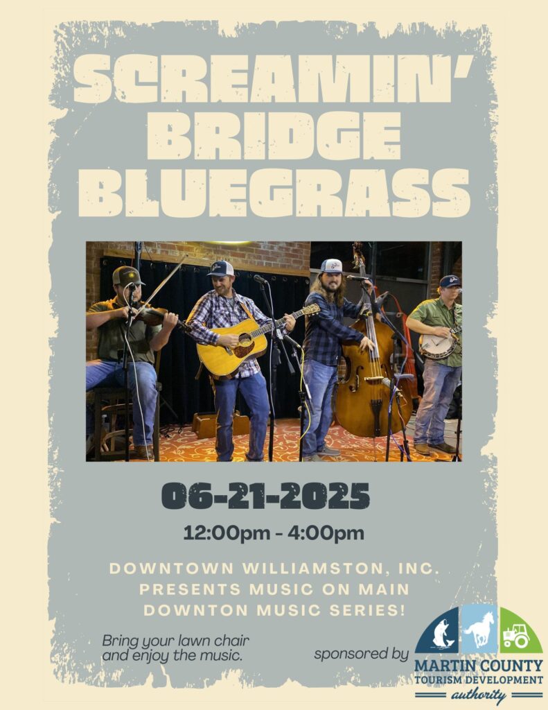 Downtown Music Series – next up… Get ready for an afternoon of foot-stomping bluegrass with Martin County’s very own Screamin’ Bridge Bluegrass band on Saturday, June 21st, from 12 PM to 4 PM at Main Street Community Stage. While you’re soaking in the music, take a stroll and shop local! Browse unique finds at our charming shops and show some love to the incredible small businesses that make our community special. Invite your friends, bring your lawn chairs, umbrella, fan, a hat, sunscreen, and make plans to be there. Let’s keep our downtown thriving!