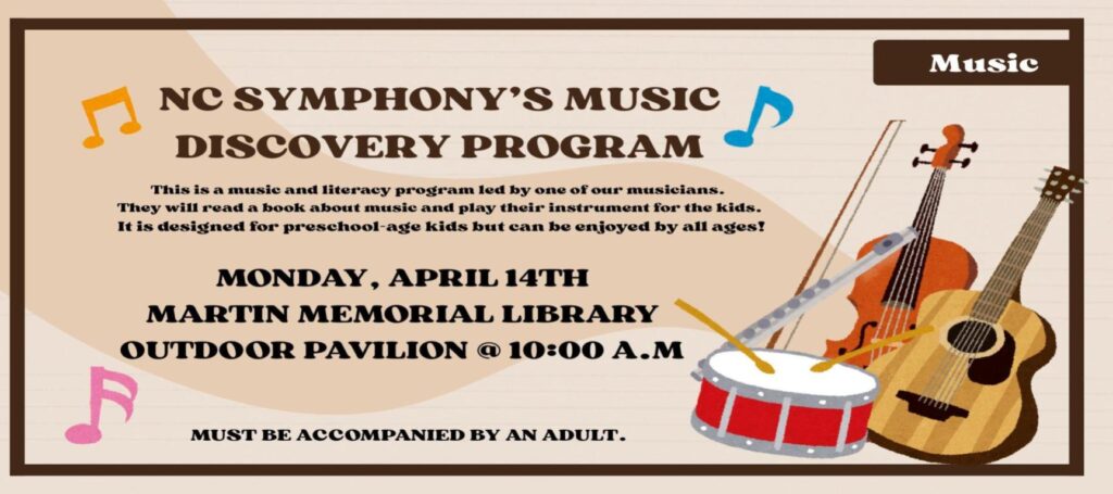 Join a musician from the NC Symphony for a music and literacy program at Martin Memorial Library. You will get to hear a book about music and hear the musician play her instrument. This program is designed for preschool aged kids but all ages are welcome.
