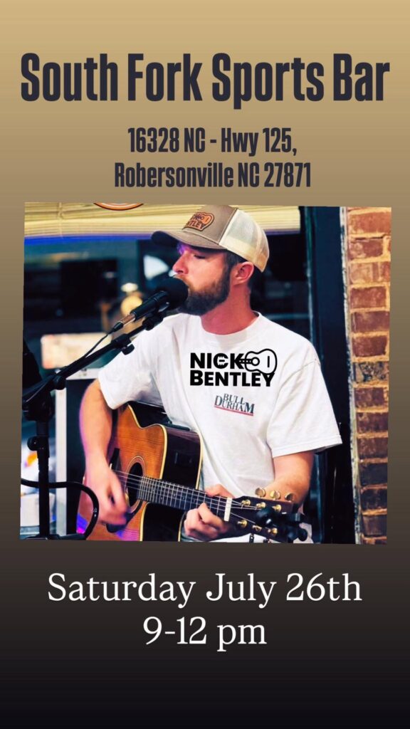 Local artist, Nick Bentley will be performing at South Fork Sports Bar & Grill in Robersonville on Saturday, July 26th. Come on out and have beers with friends, while listening to local, live music!