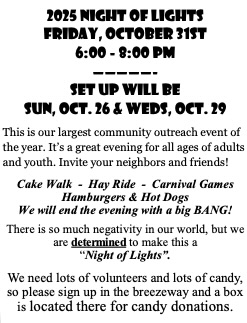 Macedonia Christian Church hosts its largest community outreach event of the year, a fall festival for all ages! Invite your neighbors and friends. Cake Walk – Hay Ride – Carnival Games – Hamburgers & Hot Dogs – The evening will end with a big BANG!