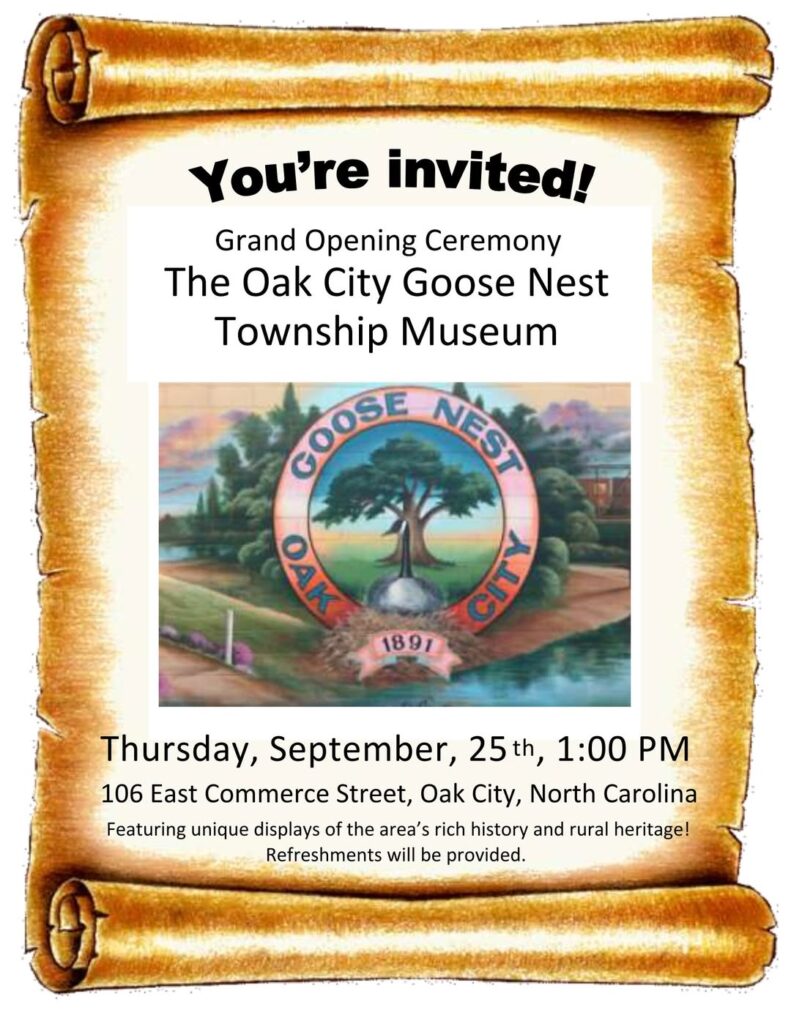 All are invited to the Oak City / Goose Nest Township Museum Grand Opening & Ribbon Cutting Celebration on Thursday, September 25th, from 1 PM to 4 PM. The ribbon-cutting ceremony will take place at 1 PM, and the museum will remain open that day until 4 PM.