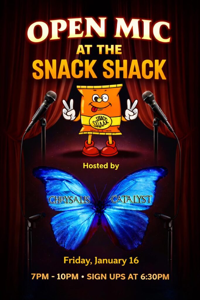 Join host Chrysalis Catalyst for a night of music and fun at the Snack Shack! Sign up at 6:30 PM. Fun begins at 7 PM.