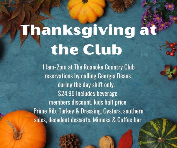 Celebrate Thanksgiving at Roanoke Country Club with a meal by Georgia Dean’s Restaurant & Bar on Thanksgiving, Thursday, Nov. 28th, 11 AM – 2 PM.