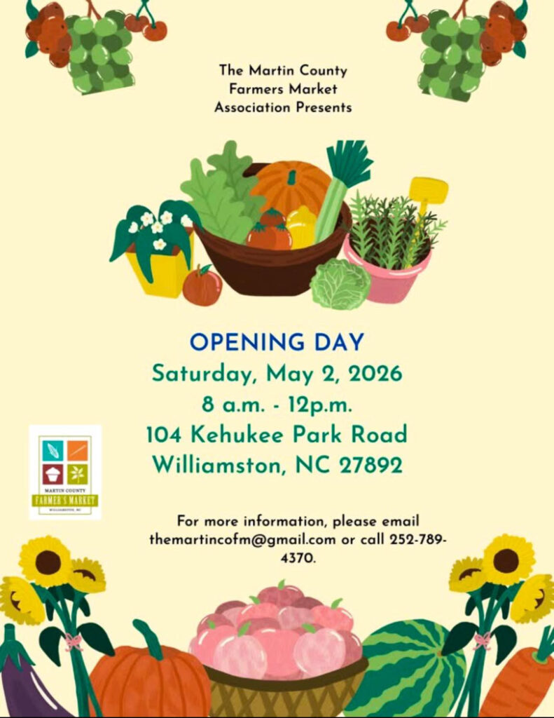 Opening Day for the Martin County Farmers Market is Saturday, May 2nd. Come out and shop a great selection of local products and art!
