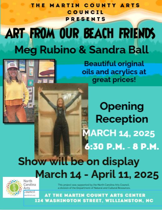 Don’ t miss this exhibition of beach art and winter scenes from Meg Rubino and Sandra Ball.