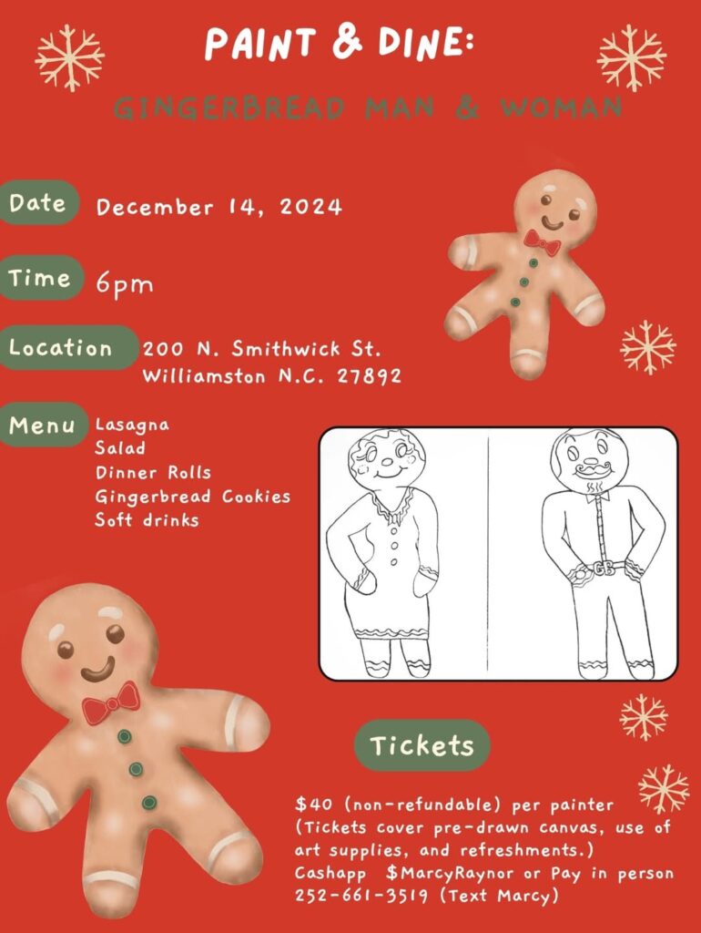 Reserve a ticket for dinner and a holiday themed painting class (supplies included with ticket) at the library in Williamston.