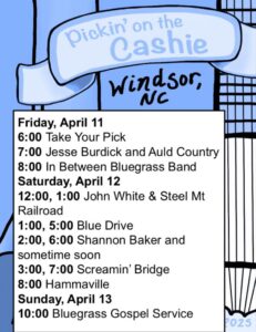 Pickin’ on the Cashie Bluegrass Festival. Three days of camping, jamming, and kayaking. Live bluegrass festival on the Cashie River taking place April 11th – 13th. Tickets available here: Pickin’ on the Cashie.