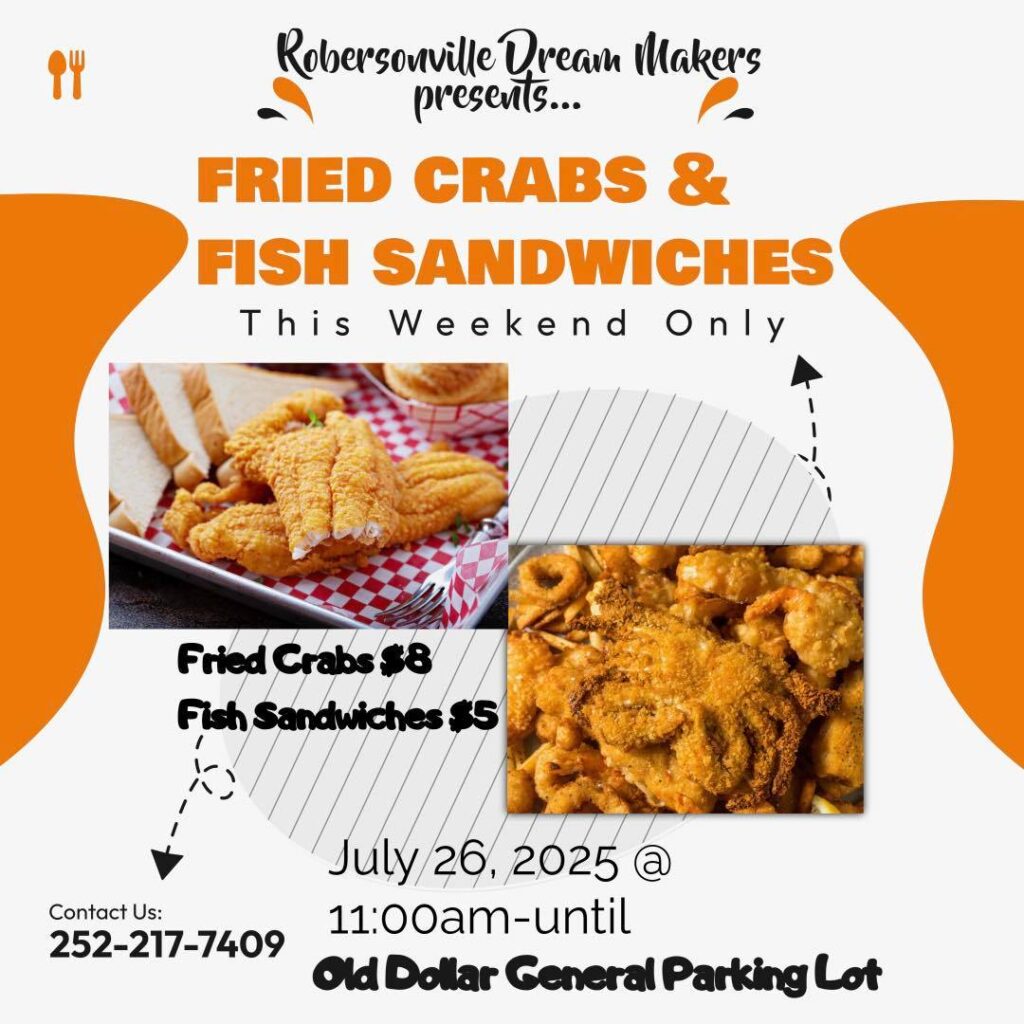 Enjoy Fried Fish Sandwiches & Fried Soft Shell Crab in support of Robersonville Dream Makers on Saturday, July 26th, from 11 AM until they run out!