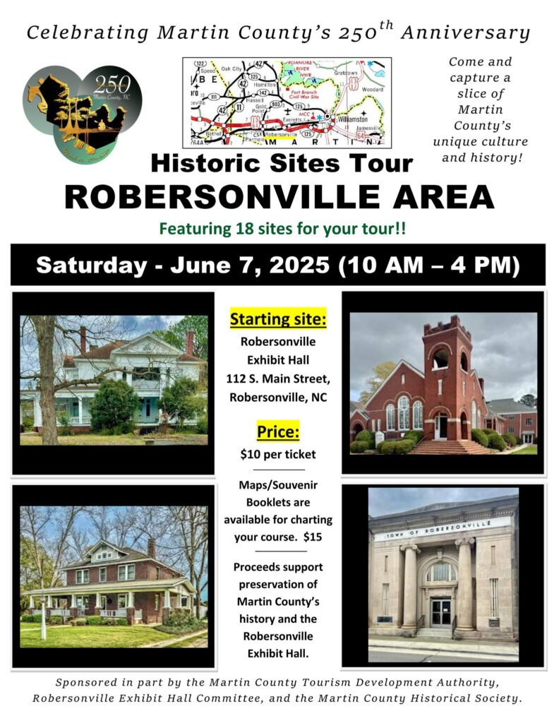Spend the day, Saturday June 7th, 2025, from 10 AM to 4 PM visiting a select group of historic homes, churches, and sites representing a slice of Martin County’s unique culture and history. This specially designed, self-guided tour will feature sites in Robersonville, Everetts, Parmele, and Spring Green. The starting site will be the Robersonville Exhibit Hall at 112 S Main St, Robersonville, NC. Tickets are $10. Maps/Souvenir Booklets are available for charting your course for $15. Proceeds for this event support the continued work preserving the history of Martin County and the Robersonville Exhibit Hall.