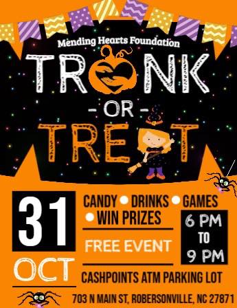 Save the date! Mending Hearts Foundation will host a Trunk-or-Treat this Halloween in Robersonville! The organization is now accepting candy donations! If you’d like to contribute some sweet treats or would like to lend a hand with the setup, please send a message on Facebook, or email contactmendinghearts@gmail.com.