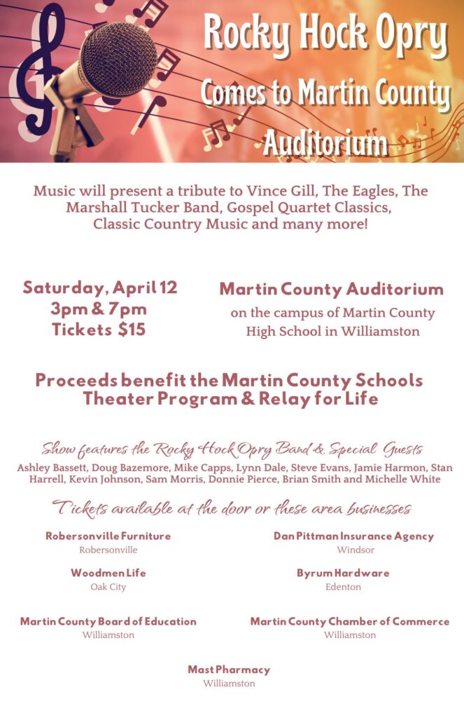 Mark your calendars for a very special event coming to the Martin County Auditorium on Saturday, April 12th. The Rocky Hock Opry is coming to town for two shows, 3 PM and 7 pPM. The show will feature tributes to Vince Gill, The Eagles, The Marshall Tucker Band, Gospel Quartet Classics, Country Music classics, and much more! Proceeds from the two shows will benefit the Martin County Schools Theater Program and Relay for Life. Tickets are available in advance or at the door. Come out and support Martin County Schools!