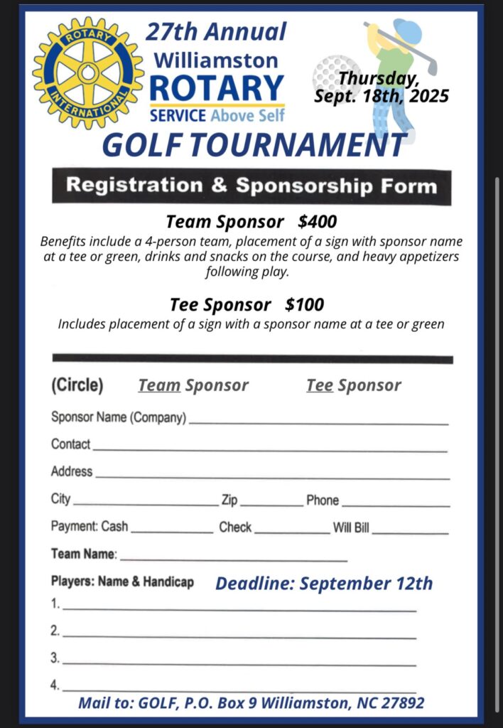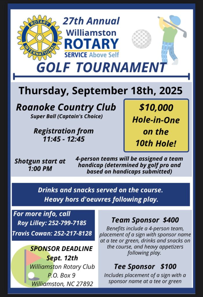 The 27th Annual Williamston Rotary Club Golf Tournament takes place on September 18th! Contact Roy Lilley (252) 799-7185 or Travis Cowan (252) 217-8128 for more info. This tournament is a fun day of golf, food, and community. Don’t miss out!