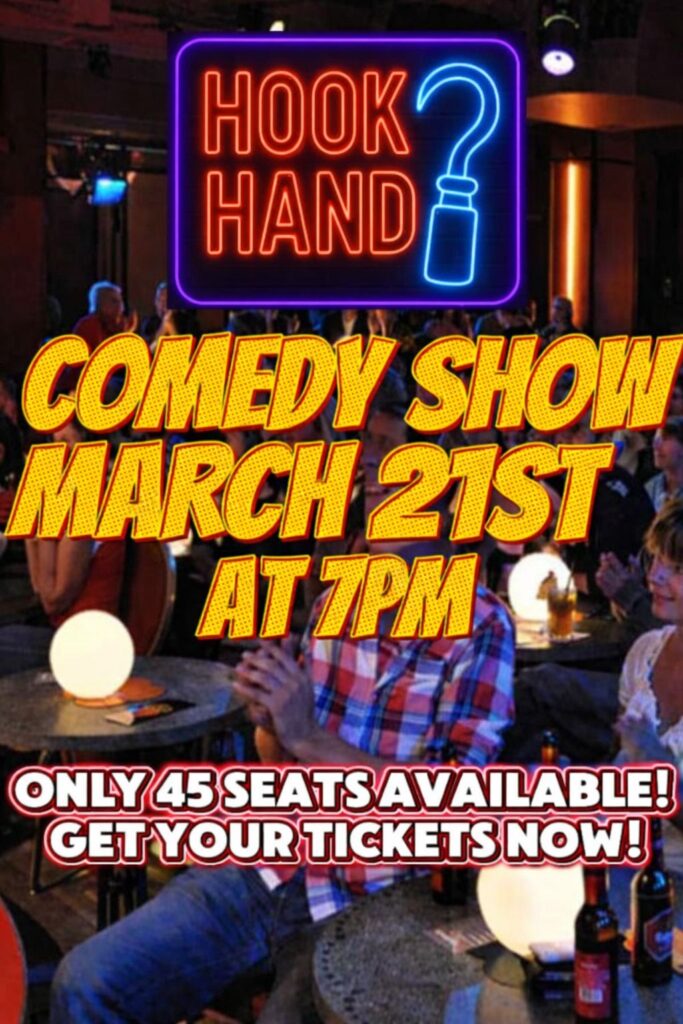 Head to Hook Hand Brewery Taproom & Art Gallery in downtown Williamston for a comedy show on Saturday, March 21st, at 7 PM. This show will be inside with only 45 seats available. Get your tickets before they sell out! Only $8! (Purchase online now, as there may not be any available on site the day of the show. The DNA Wings food truck will be on site that evening as well. See you there!
