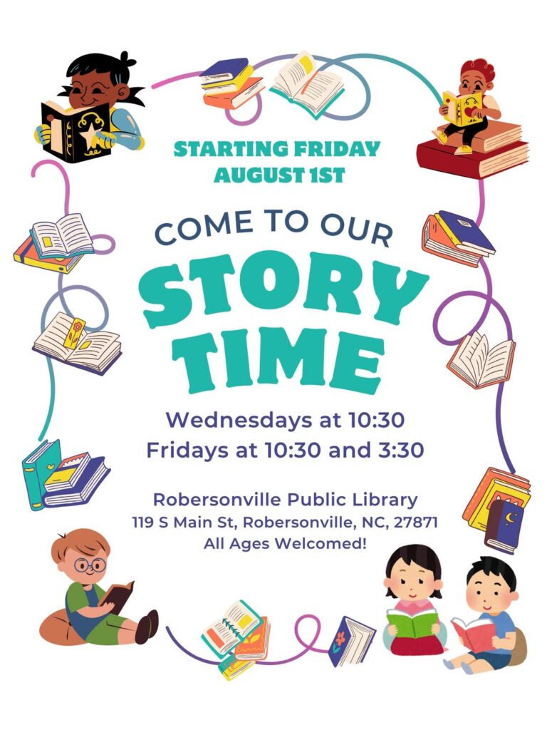 Storytime at the Robersonville Public Library takes place on Wednesdays at 10:30 AM and Fridays at 10:30 AM / 3:30 PM. Perfect for all ages! Children must be accompanied by a caregiver. No registration needed — just drop in and join the fun!