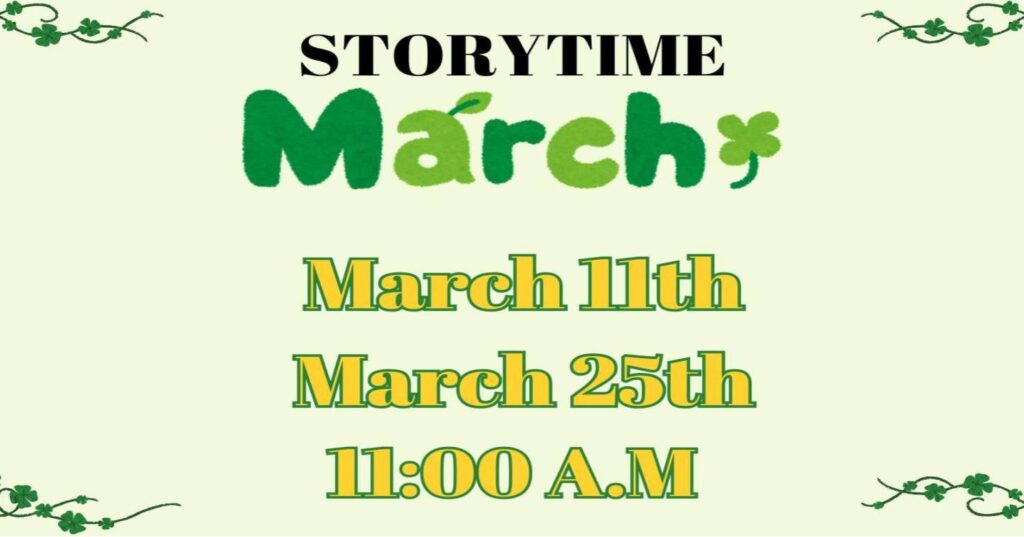 Children and their caregivers are invited to join Youth Services Library Assistant Jessika Patrick on March 11th and 25th for a fun Storytime. Storytime is for toddlers and preschoolers. It includes books, stories, songs, crafts, and other adventures in reading. All children must be accompanied by an adult.