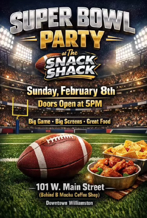Head downtown to enjoy the Super Bowl and great food at The Snack Shack! The fun begins at 5 PM and lasts until the game ends. $10 cover charge includes all-you-can-eat snacks (wings, meatballs, nachos, cocktail weenies, & more…)
