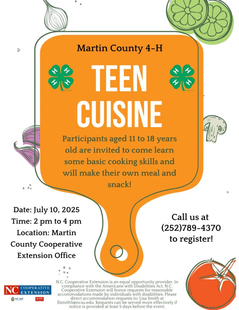 It’s SUMMER CAMP TIME! Martin County 4-H and NC Cooperative Extension will hold a Teen Cuisine event on Thursday, July 10th from 2 PM to 4 PM. Call to register at (252)789-4370.
