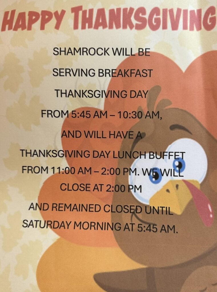 Shamrock Restaurant will serve breakfast and a Thanksgiving Lunch Buffet for the holiday this year. If you would rather have someone else do the cooking, head down to Shamrock on Thanksgiving!