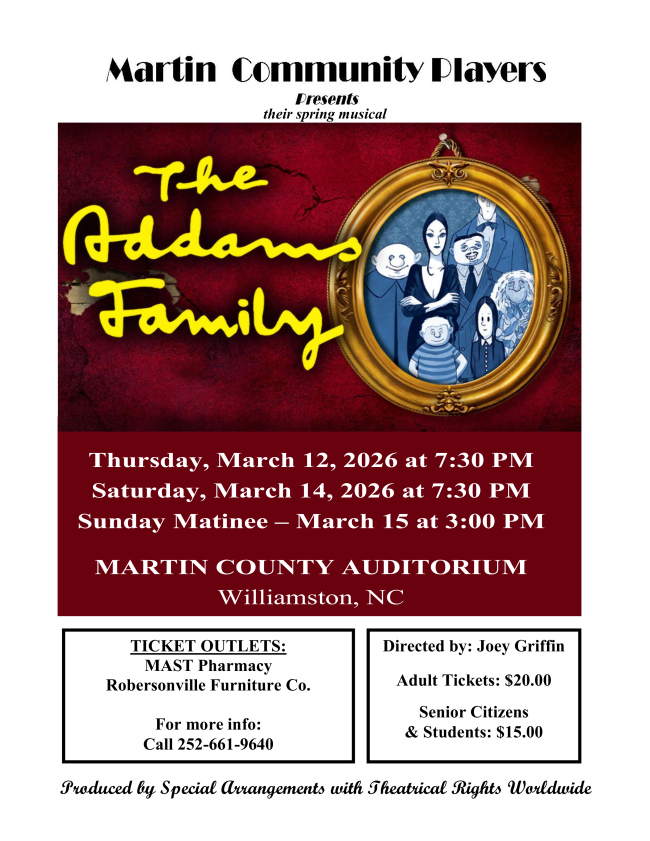 Show dates for Martin Community Players’ first performances of the year are March 12th, 14th, & 15th. Don’t miss the musical comedy, The Addams Family! It’s sure to be a spooky, fun time! RSVP on Facebook HERE!