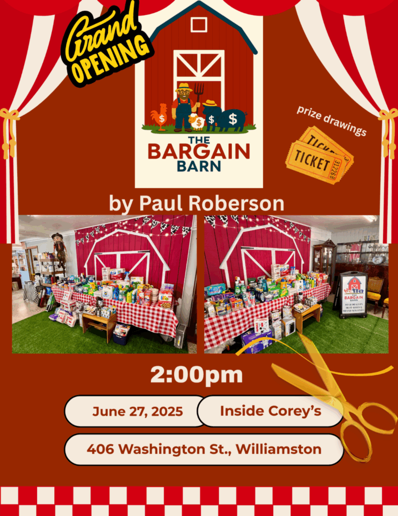 A new business in Williamston will hold a ribbon cutting ceremony this Friday the 27th. Join in fun at the welcoming of The Bargain Barn and enter to win prize drawings!