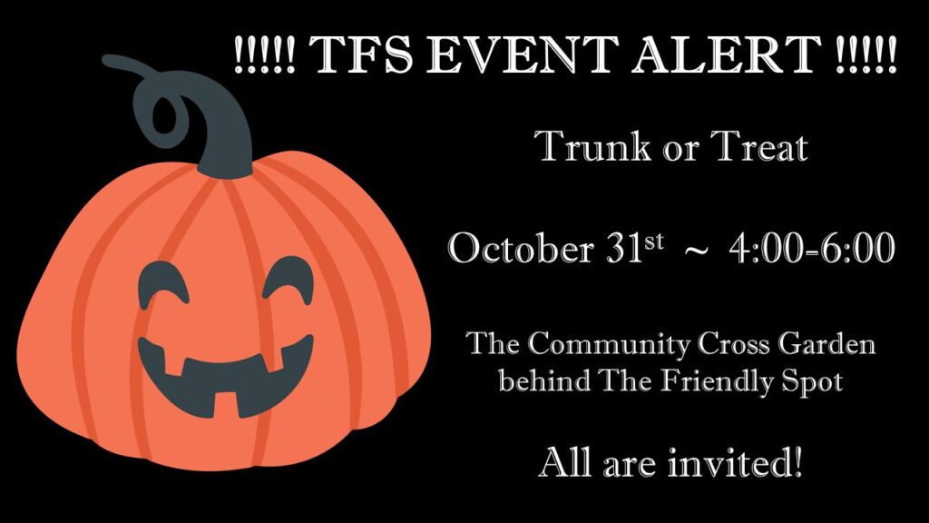 This Halloween, there will be a Trunk-or-Treat at The Community Cross Garden, hosted by The Friendly Spot in Jamesville! Feel free to join with a decorated car and pass out candy, OR just come on by with the kiddies for a treat!