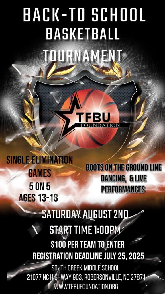 This “Back to School” basketball tournament will include an afternoon of fun activities like live music and boots on the ground line dancing. The deadline to register your team is July 25th, 2025. Seeking a teams from Bertie, Martin, Pitt, and Edgecombe Counties. It will be the battle of the counties! Single elimination!