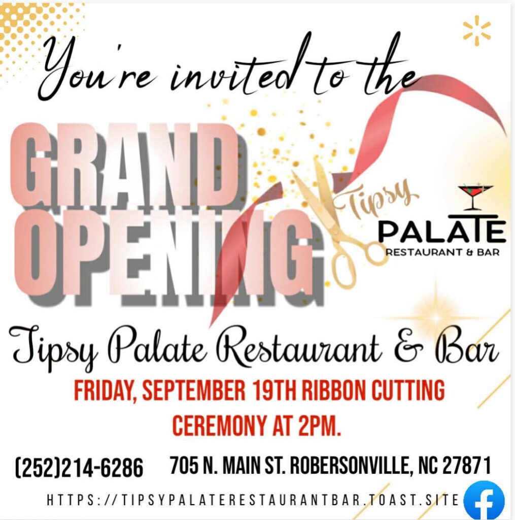 All are invited to the Grand Opening & Ribbon Cutting Ceremony of Robersonville’s newest restaurant, The Tipsy Palate Restaurant & Bar, on Friday, September 19th, at 2 PM. The ribbon-cutting ceremony will take place at 2 PM, and the restaurant is open all day from 10 AM to 9 PM.