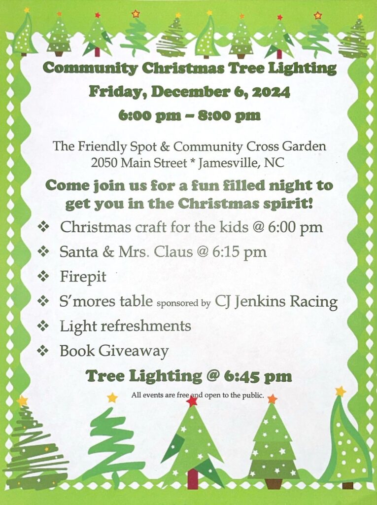 The Town of Jamesville hosts the annual tree lighting event with several more festive activities at The Friendly Spot & Community Cross Garden.