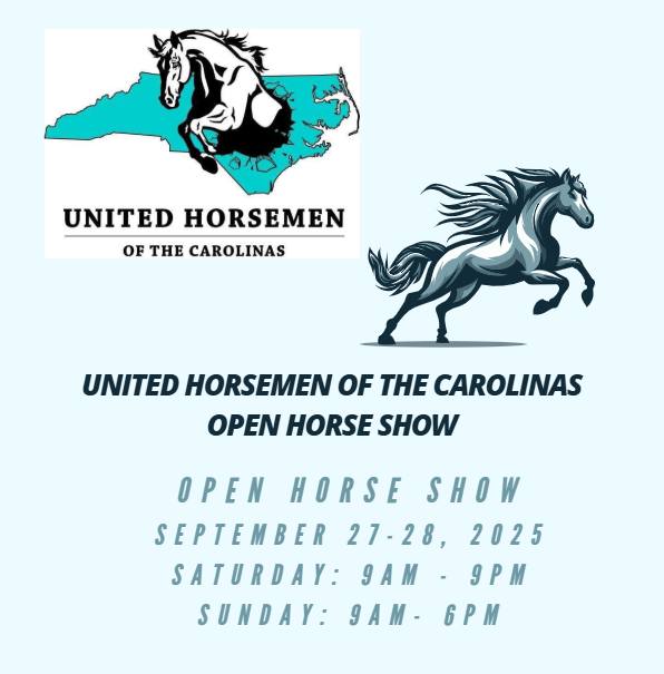 The United Horsemen of the Carolina’s Open Horse Show will take place at the Senator Bob Martin Eastern Agricultural Center, September 27th to 28th, 2025. Spectator admission is FREE! Please visit www.uhotc.org for more information.